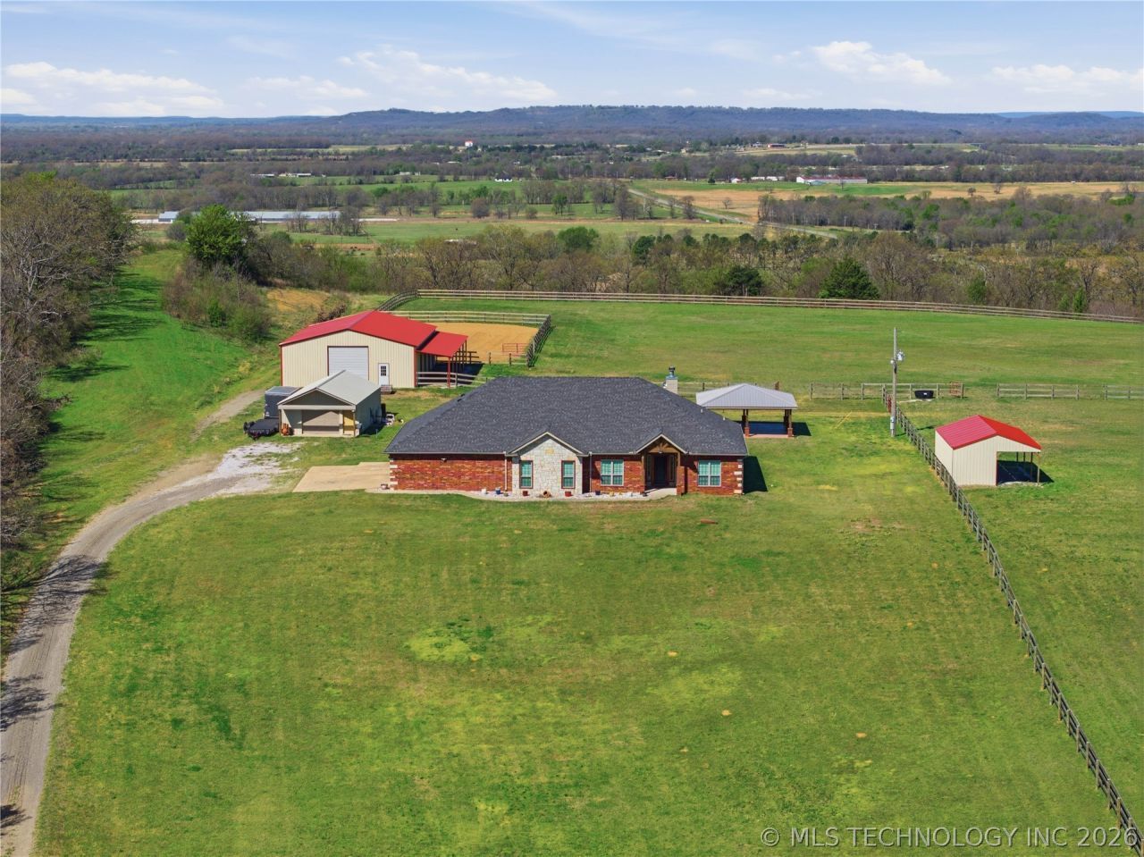 Your dream hobby horse ranch awaits on 21+ acres where you wake up to breathtaking views that stretch for miles. The meticulously maintained, 4 bed, 2 bath home is move-in ready. The kitchen features a Wolf induction cooktop and a new smart refrigerator with tap-to-view technology. Gather in the eat-in kitchen for casual meals or host guests in the formal dining room. Fresh carpeting and natural look, hewn-style wood flooring flow throughout. An oversized 3 stall attached garage provides ample space for large trucks, cars, toys and storage. Step out back to your private oasis - an in-ground pool with a high-tech self-cleaning system and a spacious gazebo for entertaining. The property boasts a 40x60 horse barn with 2 stalls, built in 2023, with exterior-access doors, and a 10 foot lean-to running the full 60 foot length. There's a 60x160 outdoor arena. Pipe & wood fencing with cross fencing and gates throughout the acreage. A 21x34 shop for equipment, built in 2024. A private lane leads to the back of the property where apprx 5 acres of woods for hunting and open space create an ideal setup for a private shooting range. Out front is a large pond with a dock for fishing! Just minutes to riding trails, dining, shopping and entertainment. Within a half mile to access I-40. 30 minutes to Ft Smith, 40 minutes to Muskogee and an hour and 20 minutes to Tulsa.