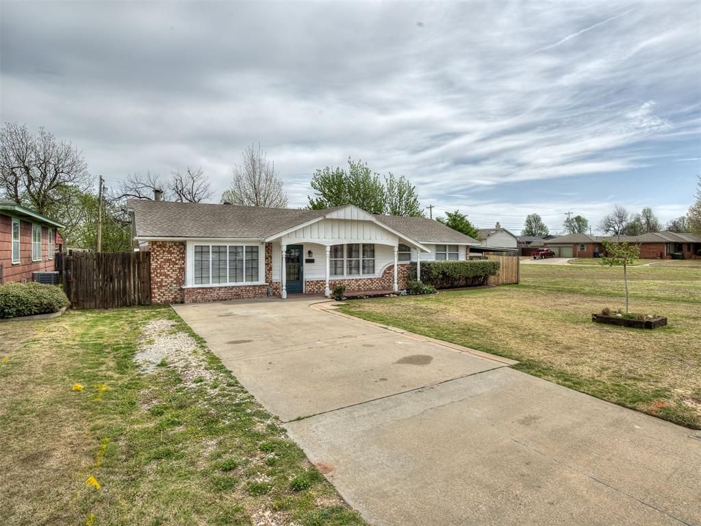 Sitting on a generous lot, this property gives you the kind of space that is getting harder to find, both inside and out. Recently refreshed with a freshly painted white exterior, this brick home now offers a clean, modern look that feels bright and welcoming from the moment you arrive. The covered front porch creates a warm first impression and a perfect place to start your mornings with coffee or unwind in the evenings. Inside, fresh interior paint and updated finishes create a clean and inviting feel throughout the home.The main living area features a custom built entertainment center with backlighting that adds a unique focal point and gives the space a warm, modern feel. The kitchen offers both charm and function, highlighted by a distinctive hammered copper sink that adds character you do not see every day. This home offers 3 bedrooms and now 2 full bathrooms, including a newly added full bathroom featuring a beautifully tiled walk in shower, custom vanity, and modern finishes that bring both comfort and style. One of the standout features of this home is the converted garage, now serving as a spacious second living area with exposed wood beams and a wood burning fireplace that adds warmth and personality. The west facing window allows natural afternoon light to fill the space, making it a comfortable place to gather, relax, or entertain.Step outside and the possibilities continue. The large concrete patio provides plenty of space for outdoor seating, grilling, and gatherings. An in ground storm shelter offers peace of mind during Oklahoma weather. The backyard also features gated rear access with covered parking, making it easy to store trailers, equipment, or additional vehicles securely behind the fence. The 18 by 24 metal shop is a true highlight, offering valuable space for tools, hobbies, projects, or storage. The backyard also includes room for fun, with an existing playground area.