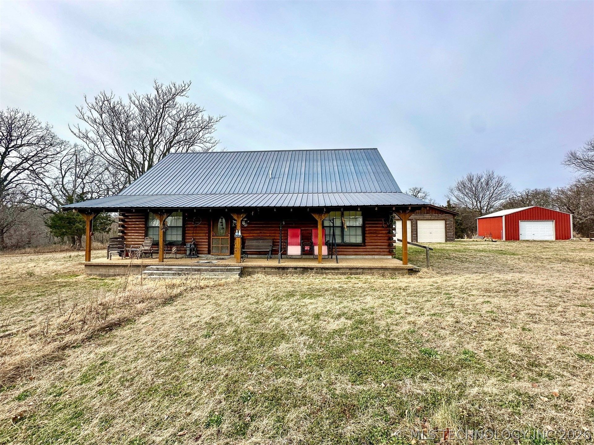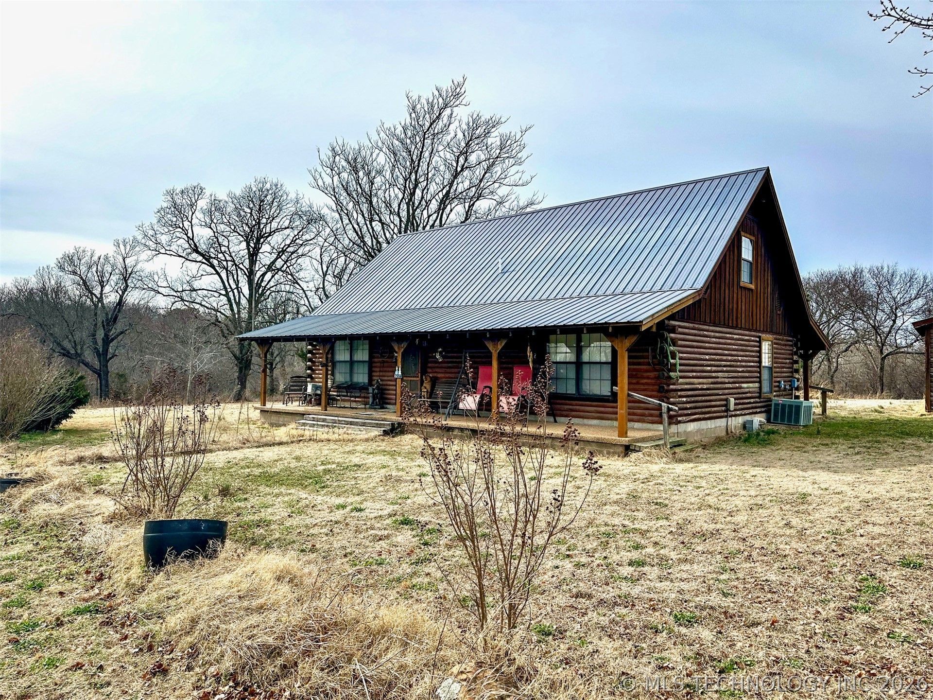 Situated on 14 beautiful acres in Peggs, this custom 1.5-story Satterwhite Log Homes home offers the perfect blend of rustic character and wide-open opportunity. With approximately 1,700 sq ft (per Court House), the home features soaring vaulted ceilings, tongue-and-groove pine, an open-concept living area, pellet stove, and central heat and air - creating a warm, inviting space that truly feels like home. Expansive covered front and back porches extend your living outdoors, offering peaceful views of the surrounding countryside and room to relax year-round. The 14 acres provide endless possibilities - ideal for livestock, horses, hay production, recreation, or simply enjoying the privacy and freedom of country living. Additional improvements include a detached 2-car garage, 20x30 shop, and impressive 40x50 barn with ample space for equipment, RV, boat, or large vehicle storage. Enjoy outdoor recreation with access to the Illinois River just 10-15 minutes away, perfect for floating, fishing, and summer fun. Conveniently located near U.S. Route 412 with an easy drive to Tulsa and Siloam Springs, this property offers the space you want with the accessibility you need. A rare opportunity to own a quality-built log home on acreage in beautiful northeast Oklahoma. Listing agent is related to seller.