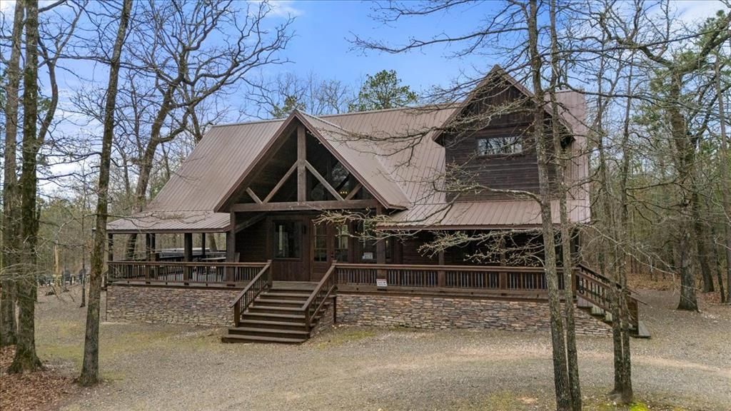 Wide Open Spaces is a striking cabin set on a 1.6 acre park-like yard designed for both relaxation and large-group entertaining. Tucked beneath a canopy of mature hardwoods. Additional ajoining 2 acres for sale. Details at MLS Listing #1221105.Inside, soaring 40-foot ceilings and expansive windows flood the open-concept living area with natural light, while exposed beams and lighting create a refined yet inviting atmosphere. The spacious living and kitchen area is ideal for hosting, complete with a gas log fireplace, large dining area, and generous seating.This 4-bedroom, 3.5-bath cabin comfortably accommodates 10-12 guests. The main level features two private king suites with en-suite baths, while the upper level offers two equally sized king bedrooms connected by a Jack-and-Jill bath. A loft with a twin daybed and trundle provides additional sleeping space.Seamless indoor-outdoor living is at the heart of this home, with four French doors opening outside to nearly 1,500 square feet of covered decking designed for year-round enjoyment. Take in peaceful wooded views and sunrise skies while enjoying outdoor dining, lounge seating, a gas fireplace, and a 55 Smart TV. The extended deck wraps around a mature hardwood and leads to a private 6-person hot tub, fire pit, and illuminated gaming area.The property's unique layout includes a circular drive with ample parking, ideal for boats, trailers, and larger groups. A dedicated Tesla outlet adds modern convenience.Ideally located near Hochatown Saloon, the Safari, and Broken Bow Lake, Wide Open Spaces delivers the perfect balance of privacy, and convenience for your next getaway or investment opportunity.
