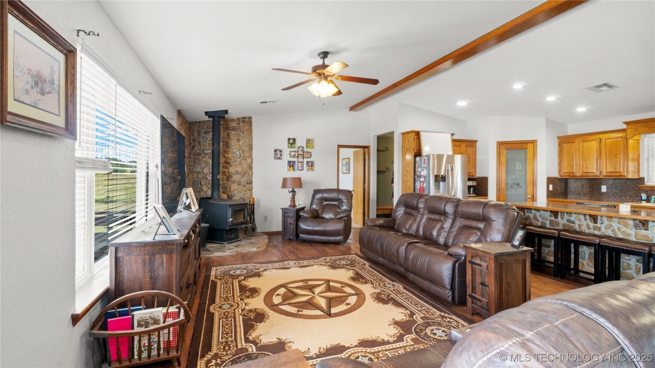 BACK ON THE MARKET due to buyer financing !!This stunning 4-bedroom, 3-bath home offers a wide area of living space and was thoughtfully designed for both comfort and functionality. Built in 2014, the property blends rural charm with modern conveniences, making it a perfect retreat just minutes from Stratford and a short drive to I-35. Inside, you'll find a spacious open floor plan featuring a large living room, dining area, and kitchen designed for entertaining. A wood-burning stove adds warmth and character, while the kitchen comes fully equipped with all appliances, including a washer and dryer. The home's durable metal roof and frame construction provide long-lasting quality and peace of mind. This property is packed with extras that set it apart. Paid-off solar panels keep utility costs low while offering energy efficiency and sustainability. A shop with electricity provides the perfect space for hobbies, storage, or business needs. Step outside to enjoy 8.64 acres of fully fenced land, complete with a revamped pond, ideal for fishing, livestock, or simply relaxing by the water. The acreage offers plenty of room for animals, gardening, or outdoor recreation, all in a private and peaceful setting. With its combination of modern upgrades, energy efficiency, and wide-open space, this home is a rare opportunity to enjoy true country living without sacrificing convenience.