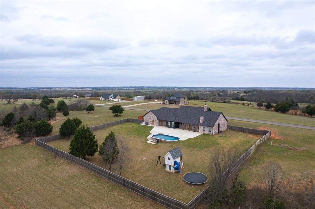Welcome to your own slice of Oklahoma country living on Lewkie Lane. This property offers the perfect blend of privacy, space, and functionality while still being just a short drive to town with easy access to I-35.Situated on over 2 acres, this custom home features 4 bedrooms, 4 bathrooms, a dedicated office, bonus room, and a large flex space, giving you the versatility to fit any lifestyle.The main level offers a wide open layout with soaring ceilings, tons of natural light, a wood burning fireplace, and a chef's kitchen complete with a large island, custom cabinetry, double ovens, and a gas range. The private primary suite is thoughtfully separated with a spacious bathroom and walk in closet, while additional bedrooms are positioned on the opposite side of the home. You will also find a massive utility and laundry room with tons of storage.Upstairs adds even more space with a bonus room, additional bedroom and bathroom, plus a large flex space perfect for a media room, gym, or game room.Step outside to your own backyard setup featuring a covered patio with a second wood burning fireplace, heated pool, outdoor shower, large patios and pool decking, fully fenced yard, and an awesome playhouse. There is also a custom firewood storage area designed to keep your wood dry with convenient access from both inside and outside.The property also includes an oversized garage with tall ceilings, a whole house water softener, a Generac generator, and a safe room located in the primary closet for added peace of mind. Washer, dryer, and refrigerator all stay with the home.If you have been looking for space, flexibility, and a property that truly stands out, this is it.