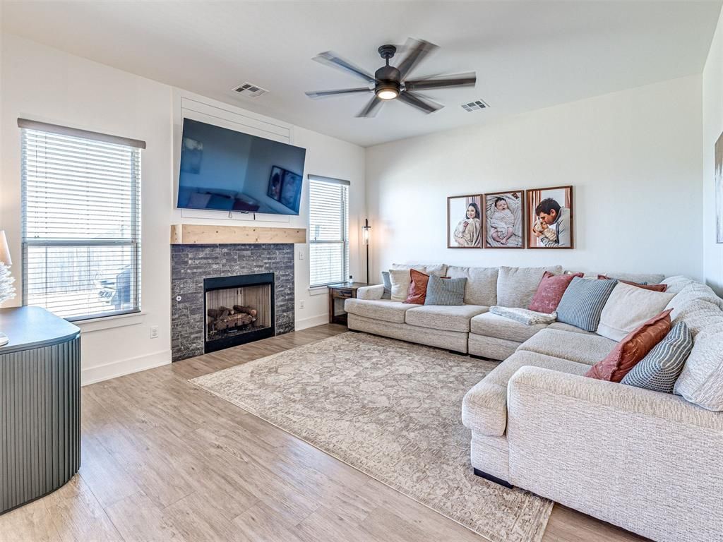 This stunning 3 bedroom + office (could be 4th bed) 2-bath home offers 1,897 sq ft of modern design, elevated finishes, and a like-new feel throughout. Built in 2022 and meticulously maintained, you get the benefits of new construction without the wait.The HUGE open-concept living space is designed for today's lifestyle, featuring upgraded designer lighting, clean lines, and a cozy gas log fireplace that anchors the room beautifully. The kitchen is both stylish and functional with a large granite island, farm sink, gas range, corner pantry, and abundant prep space-perfect for entertaining or everyday living.The private master suite is filled with natural light and thoughtfully designed with a walk-in closet that connects directly to the laundry room for seamless convenience. The spa inspired master bath offers a walk-in tiled shower, soaking tub, and generous storage, creating a true retreat.Step outside to a huge, fully fenced-in backyard with plenty of room to entertain, play, garden, or even add a future pool. It's a rare find to have this much usable outdoor space in a newer neighborhood.Complete with a 3-car garage and located just minutes from Highway 74 and within walking distance to Cashion Schools, this home offers modern style, smart design, and nearly new condition all in one.